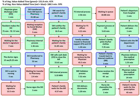 Specific to this last department, few studies have reported on the use of Lean, with a focus on reducing either the outpatient lead time [], patient length of stay [], or waiting time between activities [], among others. Here, one of the processes that is often characterized by significant delays, due to non-added-value activities, is patient discharge. This is one of the main concerns in the Mexican medical center under study as it takes an excessive amount of time (an average of 6 h) to discharge a patient. Since some studies have previously identified similar opportunities in other countries (the United States [], Netherlands [], Jordan [], and India [,], etc.), and others have provided evidence of relevant improvements [,], the purpose of this research study was to conduct a Lean Healthcare project to analyze and improve (reduce) the time to discharge patients from the Internal Medicine Department of a Mexican public academic medical center.