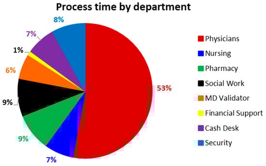 On the other hand, Figure 3 illustrates the distribution of the average total time required to discharge patients across all departments, considering value-added and non-value-added activities.