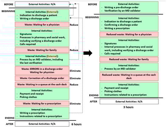 Patient discharge is a very lengthy process where delays increase the overall cost for the hospital and the patient’s exposure to acquiring new infections []. Yet, changes in the discharge timing are arguably one of the least disruptive ways to improve efficiency []. Such was the case presented in this article, where the time required to discharge patients was found to be around 6 h and later reduced without creating interruptions. Similar to what has been reported before in a general ward in Boston [] and the Internal Medicine Department in Montreal [], significant variability was identified in how the process is carried out and the preparation of the discharge prescription, having a direct impact on the time of discharge. This is mainly because the discharge order was filled during the morning on the day of discharge, and the prescription was filled and attached at the very end of the process (Figure 2). However, some authors have stated that the morning hours are unsuitable for the kind of processes and, ideally, this preparation should occur the day before discharge, when the patient has been identified (tentatively) as ready to leave the next day [,]. This early identification should trigger some final activities such as the review of test results, nurse education, writing discharge orders, medication reconciliation, and the completion of paperwork []. Along with attaching the prescription during the morning, these changes enabled the Internal Medicine Department to become more efficient: First, they foster MD validators to detect errors before the discharge process starts; second, they reduce/eliminate waiting times, as the process is carried out in a shorter period when physicians and family members are still around; and third, they allow physicians and residents to be involved in other activities in different departments without the need to go back to Internal Medicine.