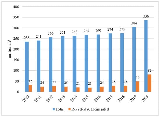 As a large economy, Russia is one of the world’s biggest producers of waste. A waste management system has still not been implemented in Russia at a large scale; for example, in 2020, only 24% of the total accumulated municipal solid waste (MSW) was recycled and incinerated (Figure 1). The largest fraction of MSW is disposed of in landfills and only a small amount of waste is incinerated; for example, in 2018, approximately 2.2% of MSW was incinerated [1]. Landfilling and incineration of waste are associated with greenhouse gas (GHG) emissions, and air and groundwater pollution [2,3,4]. Air pollution from waste incineration could result in adverse impacts on health, increasing the risk of morbidity and mortality [5,6,7,8]. A bad smell and unpleasant views are other adverse side effects of waste landfills. Recycling waste will not only eliminate the direct environmental and health impacts from incineration and landfilling, but will also reduce natural resource consumption (i.e., water and energy), thereby leading to a more sustainable development pathway.