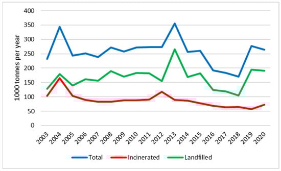 The data on collected MSW in the Murmansk region are only available for the period of 2003–2020. The average amount of MSW in that region accounted for approximately 256,000 tons per year over the period of 2003–2020 (Figure 2). More than half of that amount (i.e., 65%, on average) was placed in landfills, whereas the remainder was incinerated (i.e., 35%, on average). Unlike many other regions, the Murmansk region has an incinerator. Regarding the waste composition, paper and organic waste contributes the largest part of the total MSW in terms of weight [13] (Figure S1, Supplementary Material).
