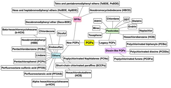 Usually, POPs are divided into two groups (see Figure 1): “legacy” POPs, i.e., substances with the particular properties of POPs that are long-recognized as harmful and controlled under international regulation since at least 2003, and “emerging” or “new” POPs that are being considered for banning purposes nowadays [7].