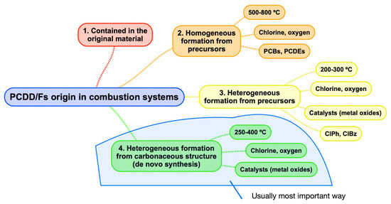 There are several theories about the molecular mechanisms by which PCDDs and PCDFs are formed and subsequently emitted from combustion sources [8]. These theories are based on observations made in municipal solid waste incinerators and laboratory studies. From the studies and reviews carried out, various pathways could be considered, although the relative importance may be very different. Schematically (see Figure 2), it can be said that it can occur that the dioxins that come out through the flue gas, the fly ash, and the bottom ash come from the initial raw material, or are formed, either in the catalytic homogeneous or heterogeneous gas phase. In the homogeneous phase, they can be formed from organic compounds smaller than dioxins/furans, called precursors, that will be chlorinated derivatives, or they can be chlorinated by the radical Cl·; in the heterogeneous catalytic phase (chlorides of Cu, Zn, Fe, and others) chlorination is carried out mainly by means of Cl2, from precursors or from carbonaceous structures (de novo synthesis). Oxygen can be incorporated into the precursors, while, in de novo synthesis, the carbonaceous structure must be oxidized [9,10,11].