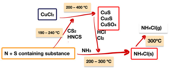However, ammonia acts in a different way, since it reduces the concentration of hydrogen chloride, necessary for the formation of PCDD/Fs [42]; that is, it blocks chlorination through the formation of ammonium chloride. Larger nitrogen and sulfur molecules appear to condense and adsorb more easily in the reaction system to deactivate the catalyst than NH3 and SO2 [40]. In any case, as Fujimori et al. [43] found, the three inhibition pathways for dioxin formation are: (i) catalyst poisoning by sulphuration of the catalyst to form compounds of the type CuS, CuS2, and CuSO4; (ii) chlorination blocking, i.e., reaction of chlorine with nitrogen compounds that would prevent the chlorination of carbon; (iii) changing the surface of the carbonaceous matrix by sulfur and nitrogen attack to inhibit the formation of chlorinated aromatic compounds during de novo synthesis. Figure 3 shows the schematic of these three ways. Temperature plays a fundamental role in inhibition since, when using a higher temperature, thiourea tends to decompose into nitrogen and sulfur compounds instead of reacting with the metal catalyst [19,43].