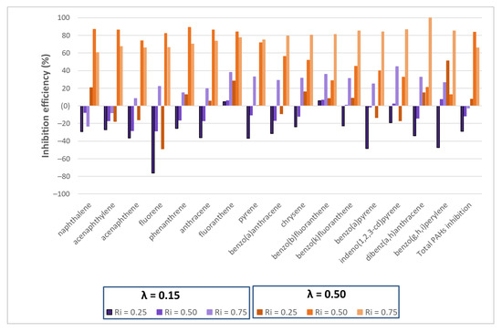 Figure 4 shows that the production of PAHs is much higher at a low oxygen ratio (λ = 0.15), as expected, due to a less efficient combustion [53]. Concerning the presence of SS, the concentration of PAHs present in the sample decreased notably when the inhibition ratio increased, with some of the compounds being reduced by more than 80% (Figure 4). In that behavior, we found that λ = 0.50 was always better to reduce the emission of PAHs, therefore, in the presence of more oxygen, the formation of PAHs is lower, with Ri= 0.50 being the mixture that showed the best results.