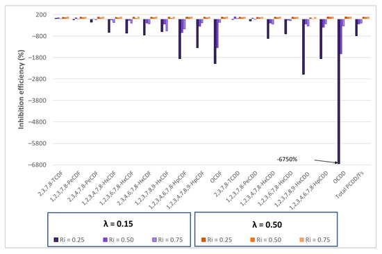 It can be observed that, when working with small inhibition ratios (Ri = 0.25) or with high inhibition ratios (Ri = 0.75), λ = 0.50 was always better to reduce the concentration of PCDD/Fs. However, for intermediate inhibition ratios around 0.50, the emissions obtained were similar for both oxygen ratios.