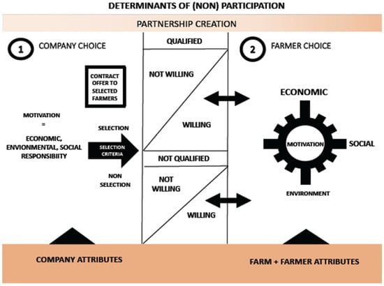 The reasons for establishing or not establishing a partnership in contract farming essentially result from the selection criteria and the preferences of the two central actors involved, the company and the farmers [54], and their capacity and willingness to comply with these. Thus, the company only offers contracts to those farmers that meet its selection criteria (qualification) [5,51], which in turn are shaped by the company’s motivation, attributes, and geographic location [60,61]. For their part, farmers may or may not be willing to participate in such a contract. Their willingness depends on weighing up the subjectively perceived costs and benefits (economic, environmental, and social) associated with the contract offered and compared with existing alternatives. The characteristics of the farmer and the farm influence this assessment. From the confrontation between the decisions of the company and the farmers, four options emerge (Figure 1): (1) the conclusion of a contract, in the case that the farmer is offered a contract (qualified) and wants it (willing); and three options for not forming a partnership: (2) the farmer wants a contract but does not receive an offer (willing but non-qualified), (3) the farmer receives an offer but does not want a contract (qualified but not willing); and (4) the farmer is not offered a contract but would not have accepted anyhow (neither qualified nor willing).