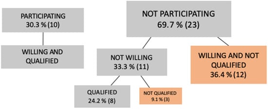 Farmer household participation in the studied inclusive agribusiness initiative for organically produced Moringa oleifera products (N = 33). Box sizes illustrate proportions; orange highlights disqualified farmers.