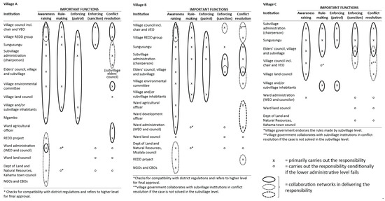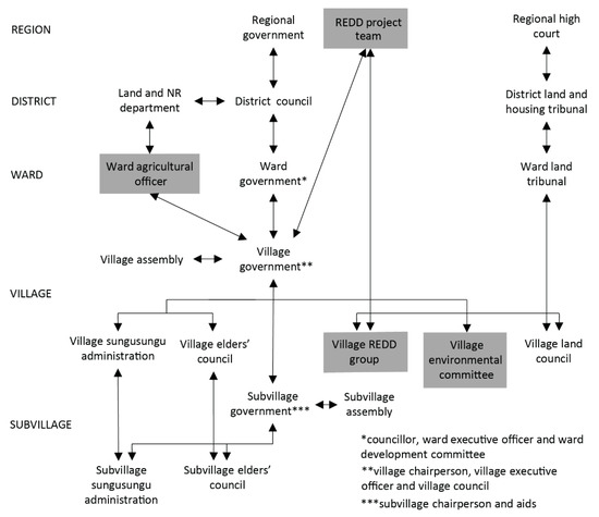 | Subvillage government with subvillage inhabitants (3) Elders’ council (1) Village government (1) Ward agricultural officer (1) Ward government (1) | Subvillage government (9) Sungusungu (4) Elders’ council (4) Village government (2 + 4) Village land council (1 + 3) Ward government (2 + 3) Village inhabitants (2) Dept. of LNR (1 + 3) Ward land council (1 + 3) TFS (+ 2) | Subvillage inhabitants via subvillage fund (3) | Dept. of LNR (tens of thousands USD, office, skills, education) Councilor (some thousands USD) Village council (some hundreds USD, office) | Dept. of LNR (12,3 n = 1) Sungusungu (11.3, n = 1) Ward government (WEO 9, n = 1, councilor 10.7, n = 1) Village government (village chair 9.7, n = 1, VEO 8.3, n = 1, village council 7.3, n =1) Elders’ council (7.3, n = 1) Subvillage government (chairs 5.9, n = 3) School (3.7, n = 1) Ward agricultural officer (2.7, n = 1) Village land council (2.3, n = 1) TFS (2.3, n = 1) |