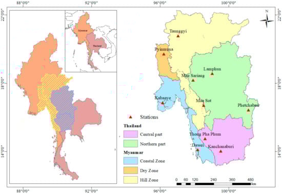 At the beginning, this study collected the daily maximum, mean and minimum temperature from 30 observation stations in Myanmar and Thailand. However, only the data from ten meteorological stations were used in this research based on data quality and accessibility. Six stations, including Mae Sariang (MSR), Lamphun (LPH), Mae Sot (MST), Phetchabun (PCB), Thong Pha Phum (TPP) and Kanchanaburi (KCB) are located in Thailand, while the remaining four stations, namely Taunggyi (TGI), Pyinmana (PMN), Kabaaye (KBA) and Dawei (DWI) are situated in Myanmar. Myanmar is located between 9°32′ N to 28°31′ N latitude and 92°10′ E to 101°10′ longitude []. The physical characteristics and topography of Myanmar can be classified into three main agro-ecological zones: the central dry zone, the coastal zone, and the hilly zone []. On the other hand, Thailand lies in the tropical zone between latitudes 5°37′ N to 20°27′ N and longitude 97°22′ E to 105°37′ E. According to the climate pattern and meteorological conditions, Thailand can be divided into five regions, namely the northeastern, northern, central, eastern, and southern parts []. In general, the selected stations can be defined by three portions i.e., southern, central, and northern of the study area. Each portion of the selected stations is nearly the same in Latitude (°N). The map of the study area and the distribution of the meteorological stations are shown in Figure 1, while the detailed information of the selected meteorological stations is provided in Table 1.