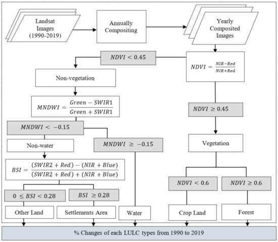 The classification approach used in this study is based on a decision tree algorithm for LULC patterns detection. Figure 2 illustrates the workflow of the LULC classification procedure using three spectral indices; Normalized Difference Vegetation Index (NDVI), Modified Normalized Difference Water Index (MNDWI), and Bare Soil Index (BSI). The NDVI is one of the most widely used remote sensing vegetation indices and has been widely used to identify vegetation based on spectral values []. The LULC was first divided into vegetated and non-vegetated areas based on the NDVI value. Forest and cropland were then separated based on their differences in vegetation fraction and growth under vegetated class. In the second step, a hybrid method was used by adding MNDWI within the non-vegetation class to separate water and non-water. The MNDWI can highlight open water features while efficiently suppressing and even removing built-up areas and vegetation and soil noises []. Bare land and settlements are notorious as those land cover types hard to separate due to spectral similarities []. Therefore, settlement areas and other land uses were separated from non-water using the BSI value. The BSI has mainly been used in forest research to distinguish bare soil and other land cover types, but has also been used for mapping and monitoring bare soil areas []. After assigning the index values to distinguish land cover types, the visualization was also interpreted and adjusted to reduce misclassification. The consideration of each LULC category is described in Table 2 [].