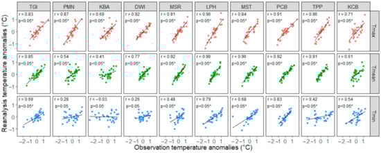 Generally, the reanalysis data are subject to high uncertainty because of the coarse spatial resolution and assimilation of limited observation [,,]. Therefore, before using in further analysis, consistency check between reanalysis and observation data could provide a basic evaluation for the reliability of both datasets [,,]. In the present study, the mean annual cycles of temperature variables (annual mean, maximum and minimum temperatures) were evaluated and correlations between the ERA5 reanalysis data and the observed data at individual stations were analyzed (Figure 3). Significant correlations were evident between the observed and ERA5 data for the interannual variability, except the minimum temperature (Tmin) for three stations of PMN, KBA and DWI. When the homogeneity test was performed, insignificant change points were detected for the observed data from these three stations. This may explain a weak correlation of Tmin between the observed and ERA5 data at these stations. The maximum and minimum correlation coefficients (r) for the annual mean temperature (Tmean) at PCB and KBA stations were 0.92 and 0.41, respectively.