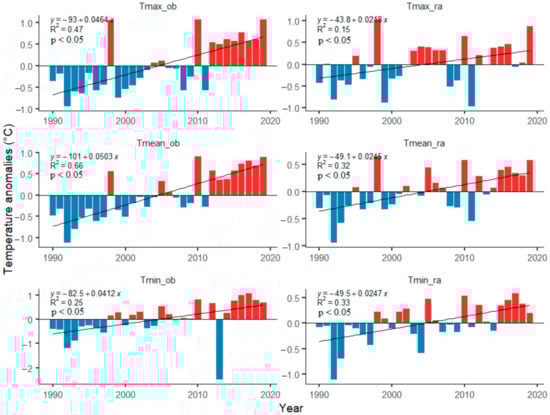 Observed and reanalyzed annual maximum (Tmax_ob, Tmax_ra), mean (Tmean_ob, Tmean_ra) and minimum temperature (Tmin_ob, Tmin_ra) anomalies at MST station from 1990 to 2019.