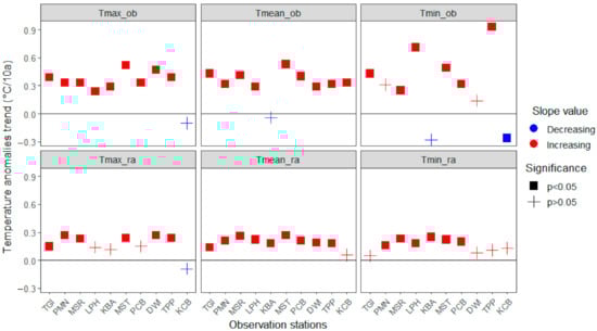 Figure 4 shows the linear trends of the observed and reanalyzed annual maximum, mean, and minimum temperatures anomalies from 1990 to 2019 at the MST station, as an example. The summary results of Mann-Kendall’s Test for all stations are shown in Figure 5. The observed annual maximum temperature (Tmax_ob) had a significant increasing trend at most stations except the KCB station. The increasing trends ranged between 0.24 and 0.52 °C/10a. For the observed mean temperature (Tmean_ob), data from all the stations indicate significant warming trends except at the KBA station. The Tmean_ob ranged between 0.29 and 0.53 °C/10a. The highest increasing trend was detected in the observed annual minimum temperature (Tmin_ob), ranging from 0.25 to 0.93 °C/10a.