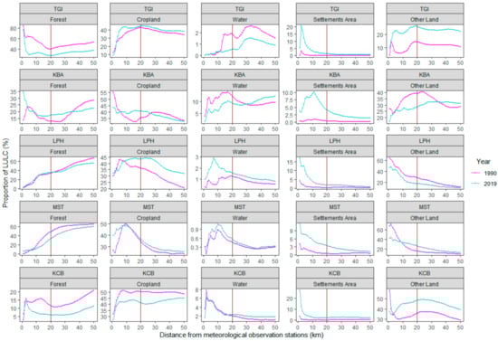 Generally, it was observed that forest land and cropland were the most dominant LULC categories for both years. The initial shift in forest areas was found around 3 km from the observation station, and its proportion around the observation station gradually increased as the distance from the station increased. The changes of cropland between two years were found around 5 km. On the other hand, the analysis revealed that the water area presented only a small LULC fraction within 50 km around the station. Water areas significantly changed from the first kilometer, except at the TGI that showed changed after 10 km. For the settlement, its areas gradually decreased with increasing distance from the station, and most of the changes between the two years were found before 30 km. Other land uses type also decreased gradually when the distance from the station increased, except at the TGI and KBA stations, where the fractions were relatively constant along 1–50 km radii.