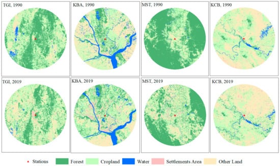 - The changes of LULC inside a 20 km radius of the selected observation stations changed significantly, as evident from the loss of forest land and increases in cropland and settlements.
