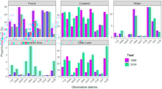 Bar plots show LULC proportion around each observed station in 1990 and 2019.