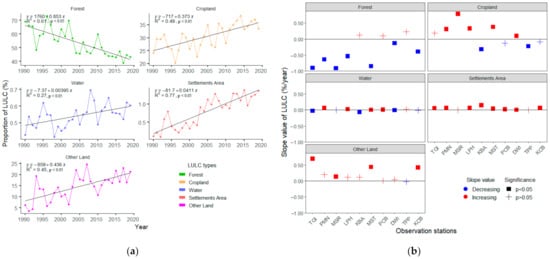 (a) An example of annual changes of LULC in different land cover types at MST stations over the past 30 years; and (b) summary of annual trends for all stations over the same period.