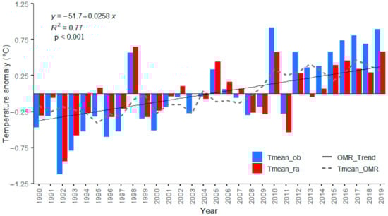 An example of observation and reanalysis time series on annual mean temperature anomalies (bar chart) and OMR values (line graph) at MST station from 1990 to 2019.