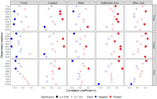 Lastly, this study could analyze only ten sites of meteorological station and could focus only on surface air temperature aspects. Further studies should aim to include numbers of the station sites across the regions. Such studies may also investigate the changes of LULC effects on other climate parameters such as relative humidity, wind, and precipitation in order to improve our understanding of LULC effects on local climate conditions and patterns at the same sites used in the current study. This is important because the changes of LULC not only affect temperature but also other climate parameters in the observation station [,,,,]. In addition, the different time scales should be examined in future work to capture dynamics of LULC and climate parameters in different seasons (e.g., wet and dry seasons).