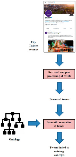 The architecture of the system is shown in Figure 1. First, the tweets sent from the official Twitter account of a destination are retrieved and pre-processed. Then, the words contained in the tweets are semantically compared with the main concepts of a domain, represented in an ontology. The result of this semantic annotation process is the association of every tweet with the concepts which are related to it. In this way it is possible to uncover which are the topics about which the destination is communicating with its followers.