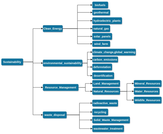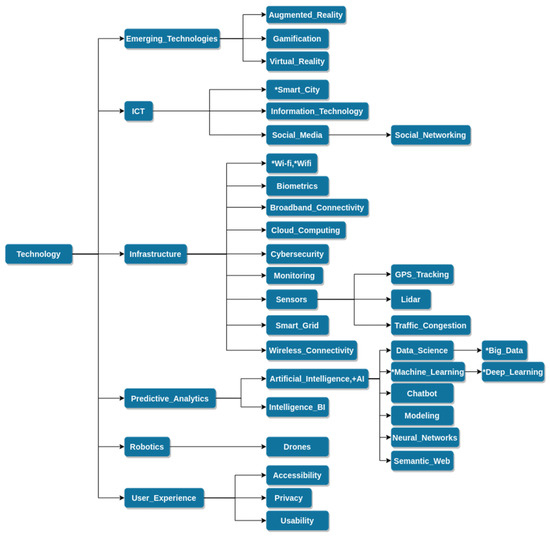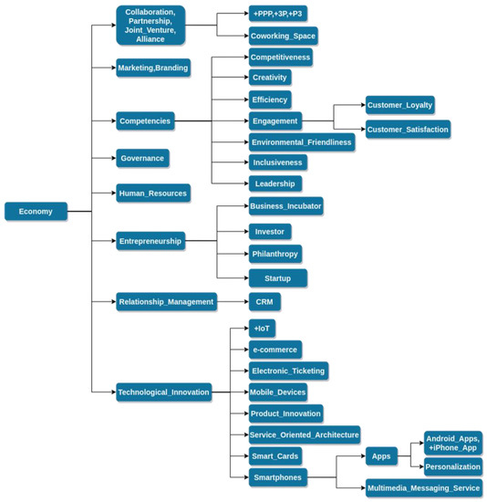 An ontology is basically a commonly shared conceptualization of a domain. It usually contains the main domain concepts linked hierarchically. In this study, only taxonomic relationships were considered. Technology, sustainability and economy, the ontologies covered in this study, are the relevant dimensions of smart cities most commonly mentioned by previous studies [28,67,68,69,70,71]. The main aspects that can be observed in these ontologies (Figure 2, Figure 3 and Figure 4) are the following: