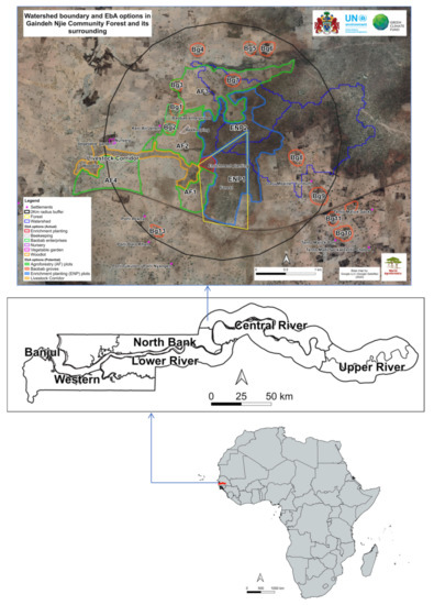 - Duguma, L.A.; Borona, P.; Minang, P.A.; Nzyoka, J.; Bah, A.; Gilruth, P.; Makui, P.; Carsan, S.; Kindt, R.; Foundjem, D.; et al. Diagnostic and a Baseline Study for Implementing Ecosystem-Based Adaptation in Rural Landscapes of The Gambia; World Agroforestry (ICRAF): Nairobi, Kenya, 2020; p. 145. [Google Scholar]