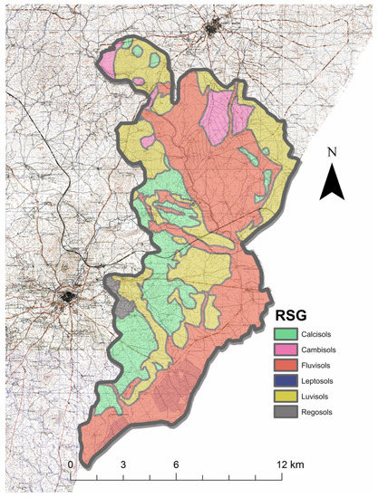 A total of 1428 and 1451 topsoil samples were collected in 2002 and 2012, respectively. There are six main reference soil groups in the 15,000 ha that comprises the study area (Figure 1) where we studied the Luvisols, Cambisols, Fluvisols and Calcisols according to the FAO’s World Reference Base [25]. A brief description of the dominant properties of the topsoil of these reference soil groups (RSG) for 2012 is presented in Table 1. Please refer to Telo da Gama et al. [21] for the 2002 edaphic description.