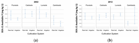 A comparative analysis between the two agricultural systems, considering the four RSG (Table 4), shows that the content of available P was the same for both agricultural systems for all RSG in 2002 (p > 0.05), while, in 2012, it was significantly higher in the Fluvisols (9.19%; p < = 0.05) and Cambisols (68.3%; p < = 0.05) in the irrigated agricultural system than in the rain-fed. In Luvisols, the available P concentration for the irrigation agricultural system is at the acceptability threshold (Table 4, Figure 2a,b; p = 0.055).