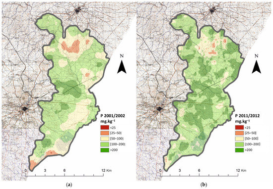 The analysis of Figure 3a,b clearly shows that the increase detected in the available P concentration also occupies most of the study area. It should also be noted that only the crops grown on 13.2% of the total study surface (i.e., with soils with less than 100 mg kg−1 of available P) would respond to fertilisation with P for most crops.