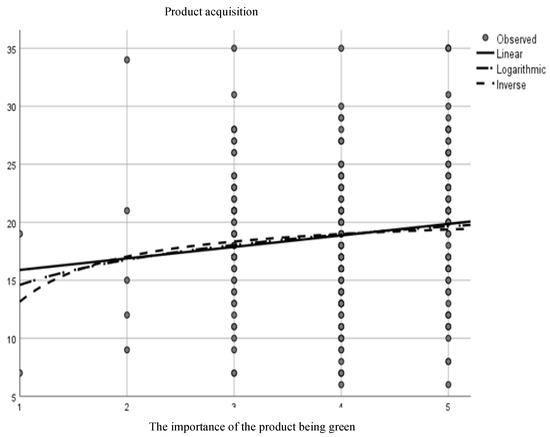 By performing this analysis, we wanted to find out if consumers who give more importance to the fact that a brand is green are more likely to buy more green products. The figure (Figure 1) and table (Table 8) presented in this sub-section show that there is a slight influence on the importance given to green brands and the number of purchases in the last 3 months of green products. The best model for estimating the relationship between the two indicators is the linear equation, with a 96% probability of the parameters of the equation being correct. That is, for each 1 degree increase in importance given to green brands, there is a 0.992 increase in the acquisition score. Therefore, Hypothesis 3 receives empirical support as well.