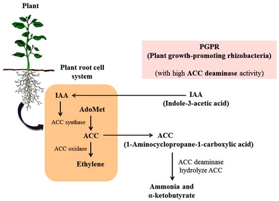 Plants growing under stressful conditions produce increased levels of 1-aminocyclopropane-1-carboxylic acid (ACC) which immediately act as a precursor for ethylene biosynthesis [199,200]. However, ethylene is a phytohormone involved in regulating various physiological processes of plants, its increased concentration imposes senescence leading to a reduction in plant growth [201] (Figure 2). PGPR helps to control plant ethylene homeostasis by expressing the genes for enzyme ACC deaminase that cleave ethylene precursor ACC to ammonia and α-ketobutyrate, thereby alleviating the level of ethylene in plants [96,202]. ACC deaminase enzyme has been reported in rhizobacteria belonging to the genera Achromobacter, Acidovorax, Alcaligenes, Enterobacter, Klebsiella, Methylobacterium, Pseudomonas, Rhizobium, and Variovorax [203].