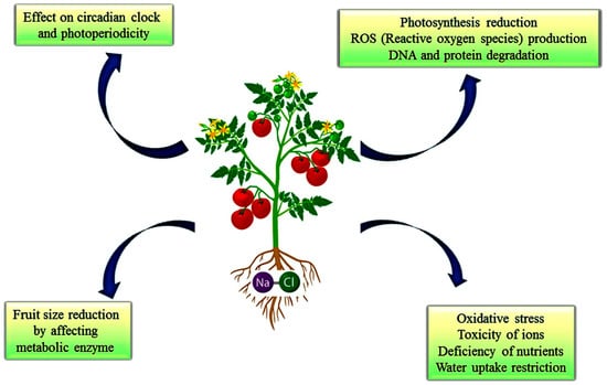 Regulation of ionic gradient is essential for the proper functioning of biological processes. The high concentration of inorganic ions such as Na+, K+, Ca2+, Mg2+, and Cl− in the soil makes soil saline and generates osmotic and ionic stress in plants. Osmotic stress is generated when salt concentrations are higher outside roots, leading to a reduction in water uptake while ionic stress is generated due to the accumulation of Na+ above a threshold in leaves [169,170]. Thus, the maintenance of ion homeostasis is essential for the development and growth of plants under salt stress [171].