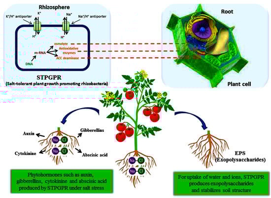 Fertilizers containing high amounts of salt not only increase the salinity of the soil, but also induce osmotic stress in plants, which ultimately hampers plant growth [236,237,238,239]. Reclamation of such saline soils for agricultural activities is time consuming and not cost effective [240,241]. The commonly used methods to reclaim saline soils are by using physical (scraping, flushing, and leaching) and chemical (neutralizing agents such as gypsum and lime) processes [242] but these processes possess fewer efficacies in hypersaline soils [243]. Salt tolerant PGPR (ST-PGPR) have been reported to ameliorate salt stress in the plant by direct and indirect mechanisms [36,244,245]. PGPRs produce phytohormones such as cytokinins, auxins, and gibberellins [246], antioxidative enzyme ACC deaminase [117,245], exopolysaccharides [247,248], and osmolytes [249,250] (Figure 5). Pseudomonas, Enterobacter, Bacillus, Klebsiella, Streptomyces, Agrobacterium, and Ochromobacter are reported to improve the productivity of crops under salt stress [251,252]. Rajput et al. [253] reported the enhancement of growth and yield in wheat crop by an alkaliphilic bacterium Planococcus rifietoensis. ST-PGPR strain Bacillus licheniformis SA03 isolated from saline soil provided increased salt tolerance in Chrysanthemum [254]. A novel salt tolerant Pseudomonas sp. M30-35 isolated from the rhizosphere of Haloxylon ammodendron reported tolerance capabilities against drought and salt. Bacillus safensis VK isolated from an Indian desert showed salt tolerance capabilities of up to 14% NaCl [255]. Its genome deciphering revealed the presence of several genes which enabled it to function in drought, hypersaline, polyaromatic hydrocarbons (PAHs), and heavy metal contamination.