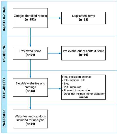 The search performed used the Google search engine. The language was Spanish and the search strings were “Software Discapacidad Física”, “Catálogo de Software Discapacidad Física”, “Software Discapacidad Motora”, “Catálogo de Software Discapacidad Motora”, “Software Discapacidad Motriz”, and “Catálogo de Software Discapacidad Motriz”. The following exclusion criteria were applied: duplicate digital catalogs, blogs and information sites, non-functional sites, sites with irrelevant or out-of-context content, and catalogs and lists in PDF format.