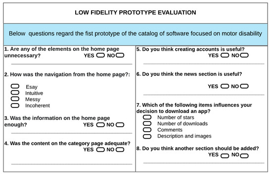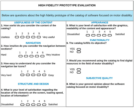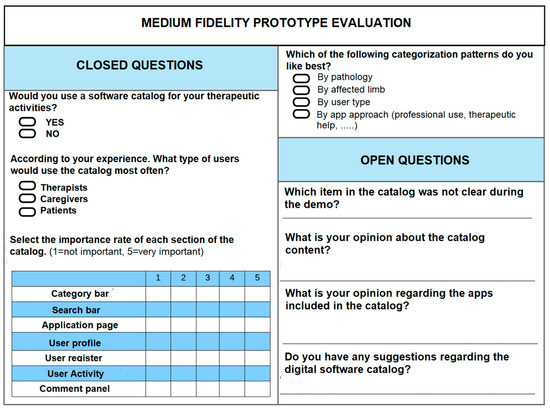 RQ2. The evaluations of the high-fidelity catalog allowed us to verify the usefulness of the catalog, its ease of use, and the correct organization of the information within it. Furthermore, it was beneficial to conduct tests oriented to the end-user and tests to software testers because it was possible to obtain the developed solution’s functional perspective and technical observations. When performing different evaluations on the high-fidelity prototype, it was possible to perceive other points of view when issuing an assessment or qualification. The review conducted with therapists and end-users helped to ensure usability. The evaluation managed by software testers helped to find errors, aesthetic facts, and technical aspects that can be improved.