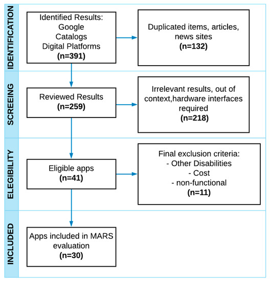 Figure 15 shows the search and selection process based on PRISMA [33]. The identification stage deleted duplicated items, articles, and news sites. The screening stage excluded irrelevant and out-of-context content. The eligibility stage filters by other disabilities, paid services, and non-functional apps. Finally, the Included step brings the final results filtered.