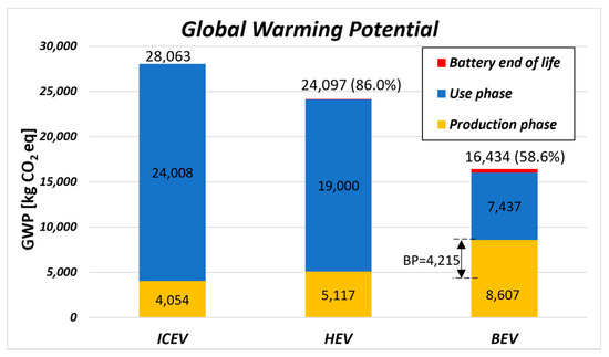 According to the assumptions made, hence, the German electricity mix was considered for all the vehicle production phases, excluding the lithium-ion batteries, whose production was instead considered under the Chinese electricity mix. In contrast, in regards to the use phase, each vehicle was supposed to travel all over Europe for the whole lifetime distance. As a result of this assumption, the European gasoline production and distribution chains were assumed for the calculation of the impact related to the fuel employed in combustion engine vehicles, and the average European electricity mix was considered to account for the impact related to the electric energy used by the BEV.