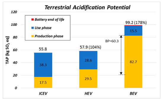- Terrestrial acidification: soil acidity variation due to acid deposition is taken into account by means of the Terrestrial Acidification Potentials (TAP) which expresses the amount of acidifying emissions (e.g., NOX, NH3, and SO2) introduced in the atmosphere in terms of the equivalent mass of SO2 [14,15].