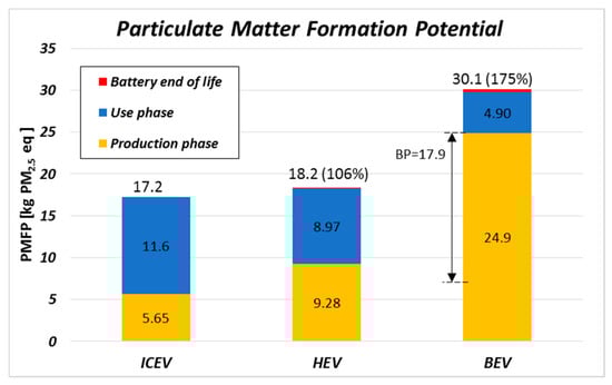 and is reported in the 4th row of Table 14. As instead regards the impact related to other relevant exhaust emissions produced by both the ICEV and the HEV, the authors referred to the emission inventory data of the European Environment Agency [34] which contains average values of the emission factor (i.e., grams of pollutant per kilometer of distance traveled) related to different kinds of vehicles (passenger cars, light commercial trucks, heavy-duty vehicles including buses, mopeds, and motorcycles), belonging to different categories (mini, small medium, large, executive, etc.), using different fuels (diesel, petrol, LPG, and CNG), and recorded on several different standard tests (starting from pre-ECE, up to Euro 6 d-temp); for the reference ICEV, the authors considered the emission factor reported for a small petrol passenger car, Euro 6 d-temp, while the reference HEV was considered as a small petrol Hybrid passenger car, Euro 6, thus obtaining the values shown in Table 14.