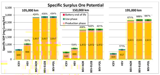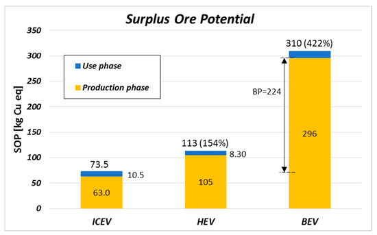 - Mineral resource scarcity: although minerals are available in almost infinite amounts in the world, the real availability of a mineral resource primarily depends on the grade, i.e., the concentration of the mineral within an ore. The primary extraction of a mineral resource leads to an overall decrease in the concentration of that resource in ores worldwide. The lower is the grade of a mineral, the larger will be the amount of ore mined to extract the same amount of resource in the future, which obviously will imply larger land use, higher energy consumption, and waste production: this is the environmental impact related to the mineral resource depletion. The Surplus Ore Potential (SOP), expressed as the equivalent mass of copper, indicates the average extra amount of ore produced in the future caused by the extraction of a mineral resource considering all future production of that mineral resource [14,15,16].