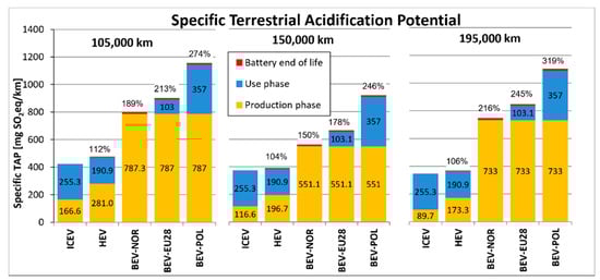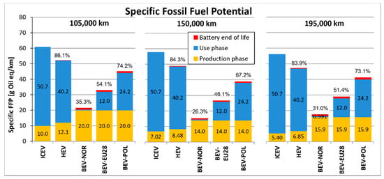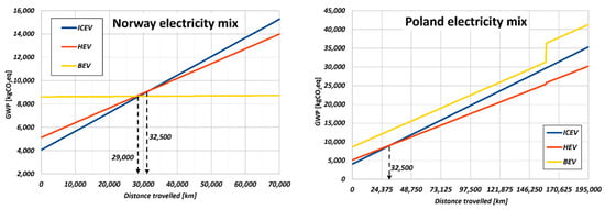Moreover, as will be shown further, with the aim to weigh the role of both electricity mix and traveled distance, a scenario analysis was also performed, adding to the comparative analysis two more lifetime mileages and taking into account the two extreme situations currently present in Europe, that is the Norwegian electricity mix, characterized by an almost null carbon footprint, and the Polish electricity mix, still dominated by the recourse to fossil sources. These cases have allowed extending the limits of the analysis, embracing all the European real possible scenarios.