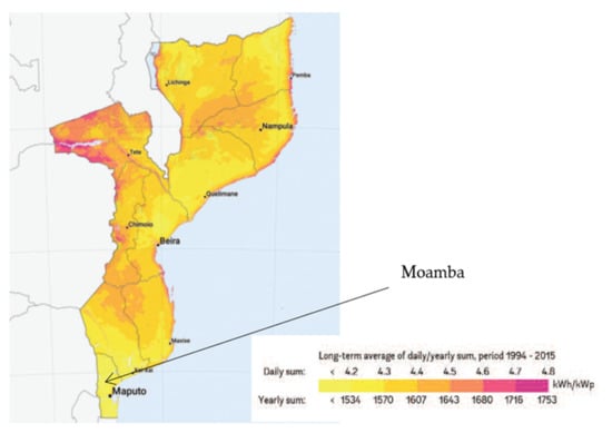 The solar energy potential of the country places Mozambique at the top of the availability of energy resources in sub-Saharan Africa [18]. In this context, if solar energy brings advantages for agricultural activity [7,19], then site conditions may influence the real performance of the system and simultaneously the crop growth based on the rain fall profile, solar radiation, temperature, humidity, etc. Hence, this paper presents the current energy and irrigation scenario in Moamba on one hand, and the climate parameters on the other, which are peculiar to the study site. Furthermore, it discusses the economic impact of the energy source transition from fossil fuel based to solar photovoltaics for irrigation purposes.