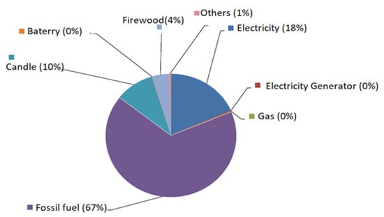 The energy scenario in Moamba is mostly characterized by the use of fossil fuels (67%) used for lighting and agricultural purposes. Firewood is used for cooking purposes. The percentage of people who have access to electricity is roughly 18% according to the last survey in this regard [22]. The graph in Figure 4 depicts the main energy sources of energy used in Moamba.