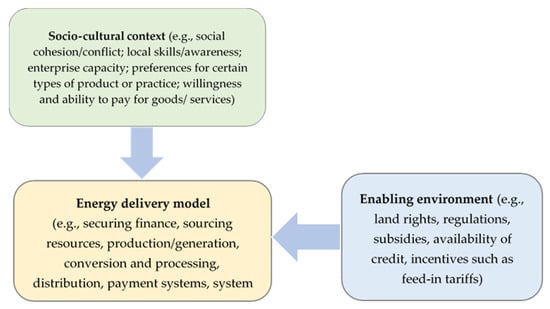 The rationale to undertake the interview was based on the fact that there must be an engagement of the beneficiaries (community/society) to the project to be implemented [27,28]. When a new technology or product is about to be introduced, the local community must be involved as a way of ensuring that the real beneficiaries will engage in it. The diagram presented in Figure 5 shows the relation that has to be established between the sociocultural context, the energy delivery model and the enabling environment.