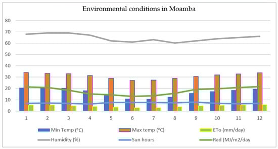 Environmental data regarding Moamba were collected from the CLIMWAT meteorological database, which receives information from on-site stations, including Moamba. The available data comprise mean values collected from 1971 to 2000 and compiled by the Food and Agriculture Organization (FAO).