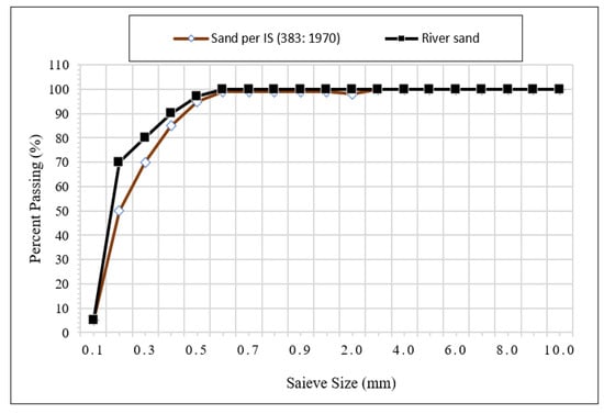 The sand was adapted to pass through a sieve with a size of 1 mm according to BS 882-1992 []. According to the British Cement Association-1994, the maximum size of fine aggregate (sand) in foamed concrete is 1.18 mm. Additionally, the percentage of sand passed through 600 microns should be between 60–90% to produce foamed concrete as shown in the particle size distribution of sand in Figure 1 [,].