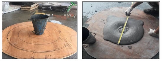 The foamed concrete was tested using the fresh density test and slump test methods. A container with 1-L capacity was used to perform the fresh density test, which was tared to zero at the balance machine before being overfilled with fresh foamed concrete. The compaction of the foamed concrete was performed by lightly tapping the sides of the container to allow consolidation of the fresh foamed concrete. The 1 litter container was weighed to obtain the fresh density of foamed concrete []. The inverted slump test was conducted according to the ASTM C995 (2001) standard using a slump cone and flat base plate. The slump cone was inverted and placed at the centre of the base plate and filled with fresh foamed concrete until it was filled. The inverted slump cone was lifted to 1 ft height within 3–5 s (s). The dimension of the spread was measured from four angles and recorded as shown in Figure 2 []. The slump flow was calculated using Equation (1).