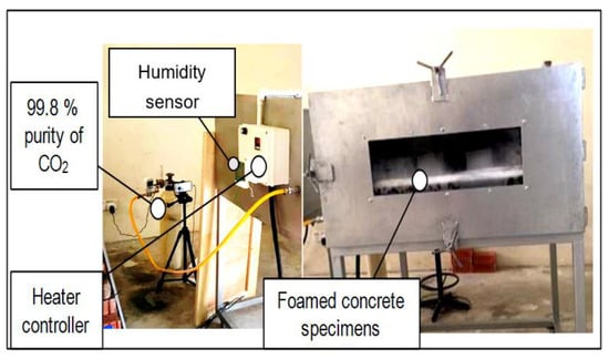 Density can cause drastic changes on foamed concrete properties, particularly strength and penetration such as carbonation depth. According to [], there is an underlining relationship between carbonation depth and density, since the increase in density increases the carbonation depth. Similarly, Namsone [] reported that the most critical factor affecting the carbonation of foamed concrete when compared to normal concrete is the density because the change in density resulted in a change in level of porosity. It is possible to produce high pores foamed concrete with density 300 kg/m3, which has the capability to accelerate carbonation; however, the strength of the specimens will be lower than 1 MPa []. On the other hand, concrete with density more than 1850 kg/m3 will be out of the range of foamed concrete density 300 kg/m3–1800 kg/m3. Therefore, 1300 kg/m3 and 1800 kg/m3 was selected as low and high levels of densities in this study to produce FCB. Density is not the only factor affecting the carbonation of foamed concrete, particularly the curing conditions such as CO2 concentration, as temperature and humidity also play a vital role too [,]. Many researchers have stated that the best range of relative humidity to accelerate carbonation in concrete is 50–70% [,]. However, the humidity is influenced by the changes in temperature degree and CO2 concentration [].