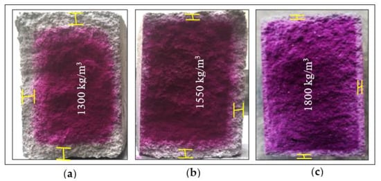 The increment of carbonation depth in concrete with low density compared to concrete with a higher density is a normal effect []. However, the purple-red colour in the specimens with 1800 kg/m3 was obtained due to the extreme pH value []. Thus, the portlandite (Ca(OH)2) has the ability to control Ca and caused an expansion of the solid volume inside the concrete at pH > 12 [,]. Furthermore, the used of temperature between 27 °C and 40 °C help to keep H2O in portlandite (Ca(OH)2), which in turn increased CO2 ensuing from the carbonation. In contrast, note the higher temperature corresponding to loss of H2O as well as the solubility of CO2 in concrete [,].